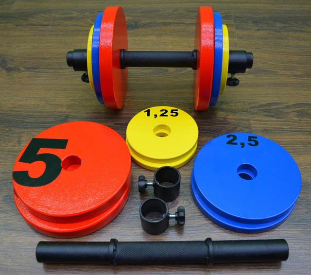 - 12 дисків по 5 кг, 4 диска по 2.5 кг, 4 диска по 1.25 кг.