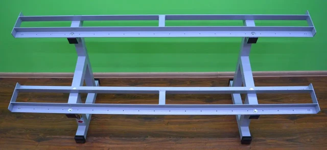 - Стелаж призначений для зручного зберігання 10 пар гантелей загальною масою до 600 кг в умовах закритих приміщень.
