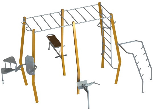 - Станція складається з упору для віджимань, платформи для вишагування, брусів, упору (стійки) для преса, рукохіду, турніки, гиперєкстензии і лави для преса.